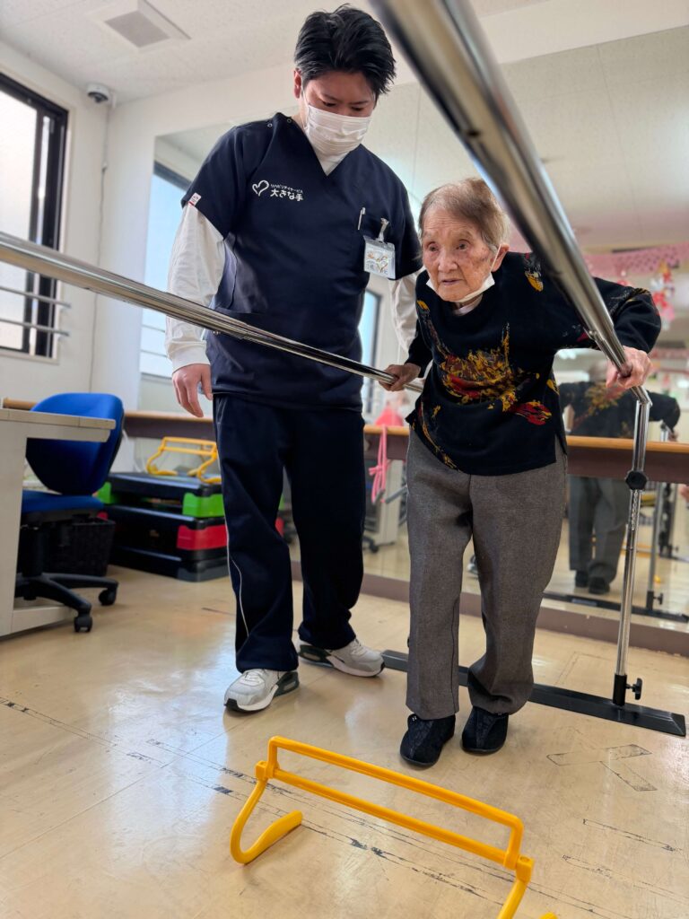 リハビリ運動の種類も豊富です。リズム体操中にみんなで笑顔を作る「笑顔リズム体操」、紙で作った棒を使って指先からつま先までの全身運動ができる「棒体操」、日常動作を取り入れた複合動作訓練の「サーキットトレーニング」、車イスのままでも上肢下肢のトレーニングができる「セラバンド」、また平行棒を組み合わせた「平行棒セラバン運動」などさまざまなプログラムに取り組んでいます。