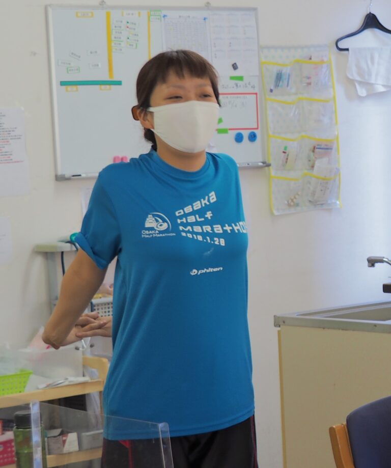 フロアでは体操したり、利用者様とお話をしたりしています。またトイレに行くのがむずかしいかたにはお手伝いをさせて頂いてます。