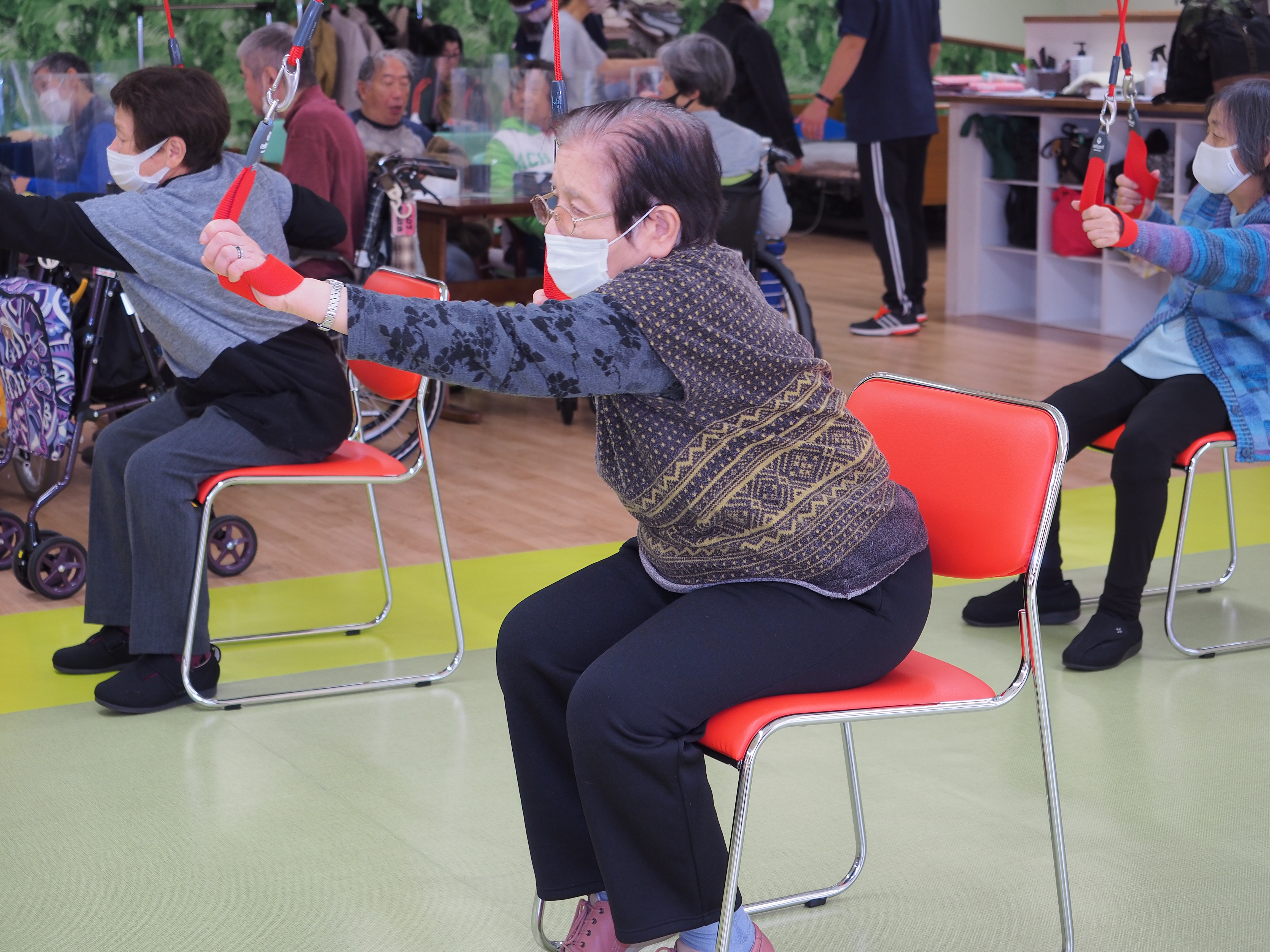 そして、「あべの」での大きな目玉は「レッドコード」です。レッドコードとは、リハビリ先進国ノルウェーで約30年間、学術研究、臨床知識により裏付けされたエクササイズです。医療、予防、スポーツ・パフォーマンス向上に至るまで、多様なフィールドで、全ての方に使用可能です。世界各国で使用され続けアスリートから患者様まで幅広い層から愛用されております。そんな「レッドコード」を高齢者向けにプログラムをし、柔軟性を高め、体幹を強化することを目的に取り入れています。