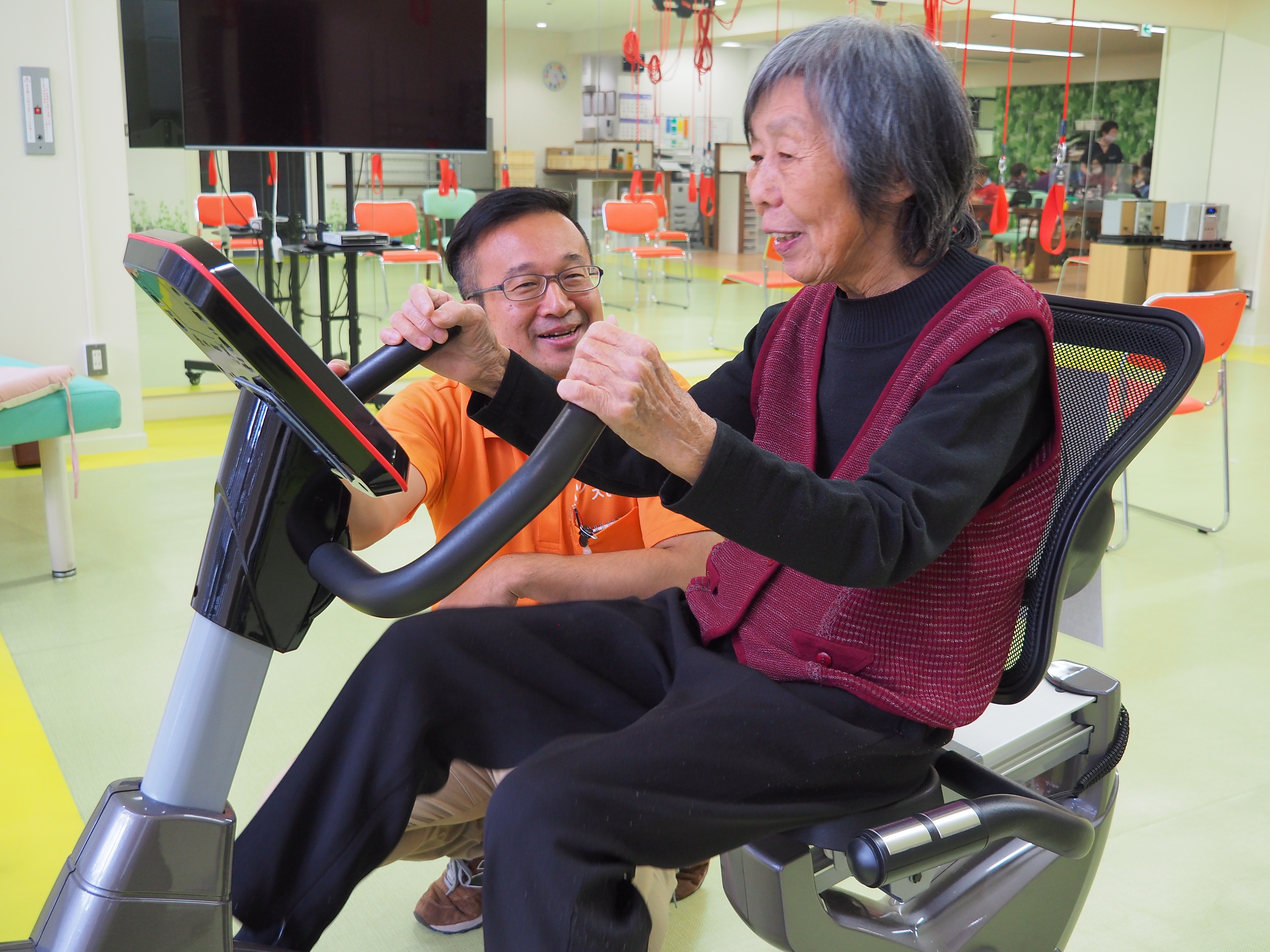 「笑顔」のために「シニアエクササイズ」はいかがでしょうか? いつまでもご自分の足で歩くことができる、あるいは少しでも自分の力で歩いてみる、そんな下肢トレーニングを実施しています。溌剌としたトレーナーの指導のもと、とても楽しく取り組んでいます。また、認知症予防のために、みんなで歌を歌いながらのステップ運動も人気プログラムのひとつです。声を出すことで、大きな発散にもなっています。これらのプログラムは和歌山大学監修のもと、エビデンスに基づき実施されています。